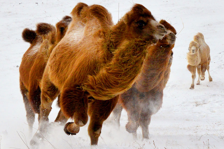 Several camels wander along the desert in the heavy snow. Photo provided to chinadaily.com.cn]